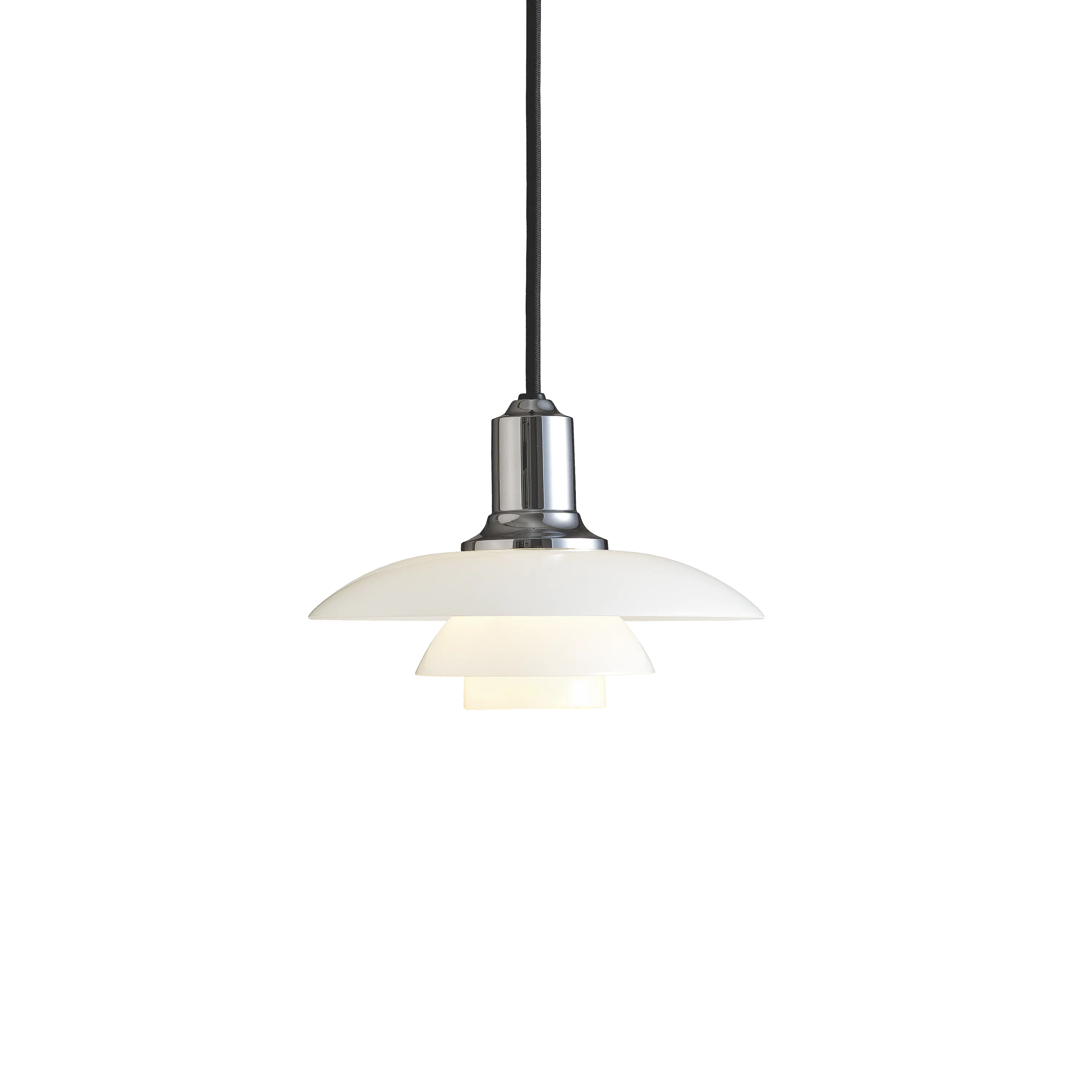 Poul Henningsen designed the three-shade system during 1925/1926. The first lights using the system were designed for an exhibition in Paris. His work with Louis Poulsen continued until his death in 1967. Throughout his life, PH sought to create glare-free lighting; aiming to direct light where it was most needed, and creating soft shadows while using incandescent bulbs as a light source. The PH 2/1 Pendant is a member of the three-shade family and is one of 19 versions available today. Approximately one thousand models have been produced over the years and consisted of table, floor and wall lamps, as well as a number of chandeliers, which were popular in the 30s for lighting private homes with high ceilings. There were countless combination options. The lights were available in different colors, as well as a range of sizes. The first shades were made of metal with a painted underside, such as white, gold or silver depending on whether diffuse, warm or cold light was desired. Glass was later introduced to the three-shade system. In addition to the downward-directed light, glass lamps illuminated the room. PH was the first person to pursue a scientific approach to light and use the logarithmic spiral as a basis. By using a design based on the logarithmic spiral, he achieved even distribution of light over the entire curve of the shade. This even light distribution, together with the diffuse reflection through the glass, made it possible to control glare and shadow. Each shade reduces the amount of light equally due to their distance from the light source. The PH light model numbers refer to the shade size. Each top shade had a corresponding set of middle and lower shades. In the pure models, such as the 2/2, the top shade has a size of about 20 cm, with corresponding lower shades. The PH 2/1 Pendant consists of an approximately 20 cm top shade, but uses lower shades from the 1/1 model. These hybrid models were introduced due to the desire to hang the pendants at lower heights.