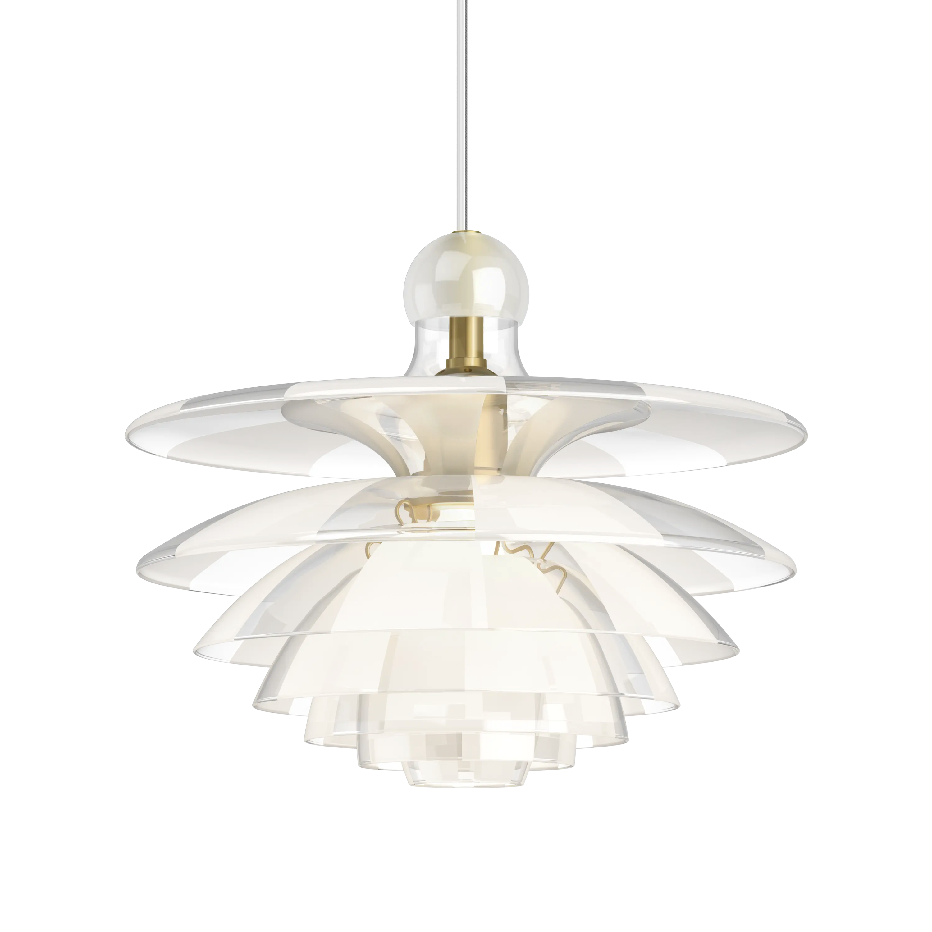 The PH Septima is regarded as one of Poul Henningsen’s most refined pendants. When it was exhibited for the first time as a prototype at the Danish Museum of Decorative Art (now "Designmuseum Danmark") in 1928, the poetic piece was publicly applauded. Based on Henningsen's three-shade system, the glass crown has four extra shades inserted between the three basic shades - all seven produced in very delicate, but robust, Italian borosilicate glass. The shades made of clear glass are treated to appear with alternating clear and frosted fields and are positioned so that the frosted fields cover the clear fields underneath, allowing the shades to spread the light in a more diffused manner while maintaining glare-free, downwardly directed light distribution. In addition, a neat round glass cup is placed at the top to prevent dust, etc. from falling into the lamp. In 1931, a smaller version, PH Septima 4, was launched based on the shade sizes from the PH 4/4 lamp, whereas the original PH Septima 5 is based on shade sizes from the PH 5/5. During the development of the PH Septima, Henningsen designed a metal version as well, but it never reached production. The drawings, however, formed the basis for the development of the PH Artichoke, designed around three decades later, for the Langelinie Pavilion in Copenhagen. In the 1940s, however, the esteemed PH Septima went out of production along with numerous other lamps due to a shortage of raw materials. In 2020, Louis Poulsen brings back Henningsen’s sophisticated seven-shade glass crown, based on the PH Septima 5, with optimized suspension and enhanced glass for better endurance and stability.