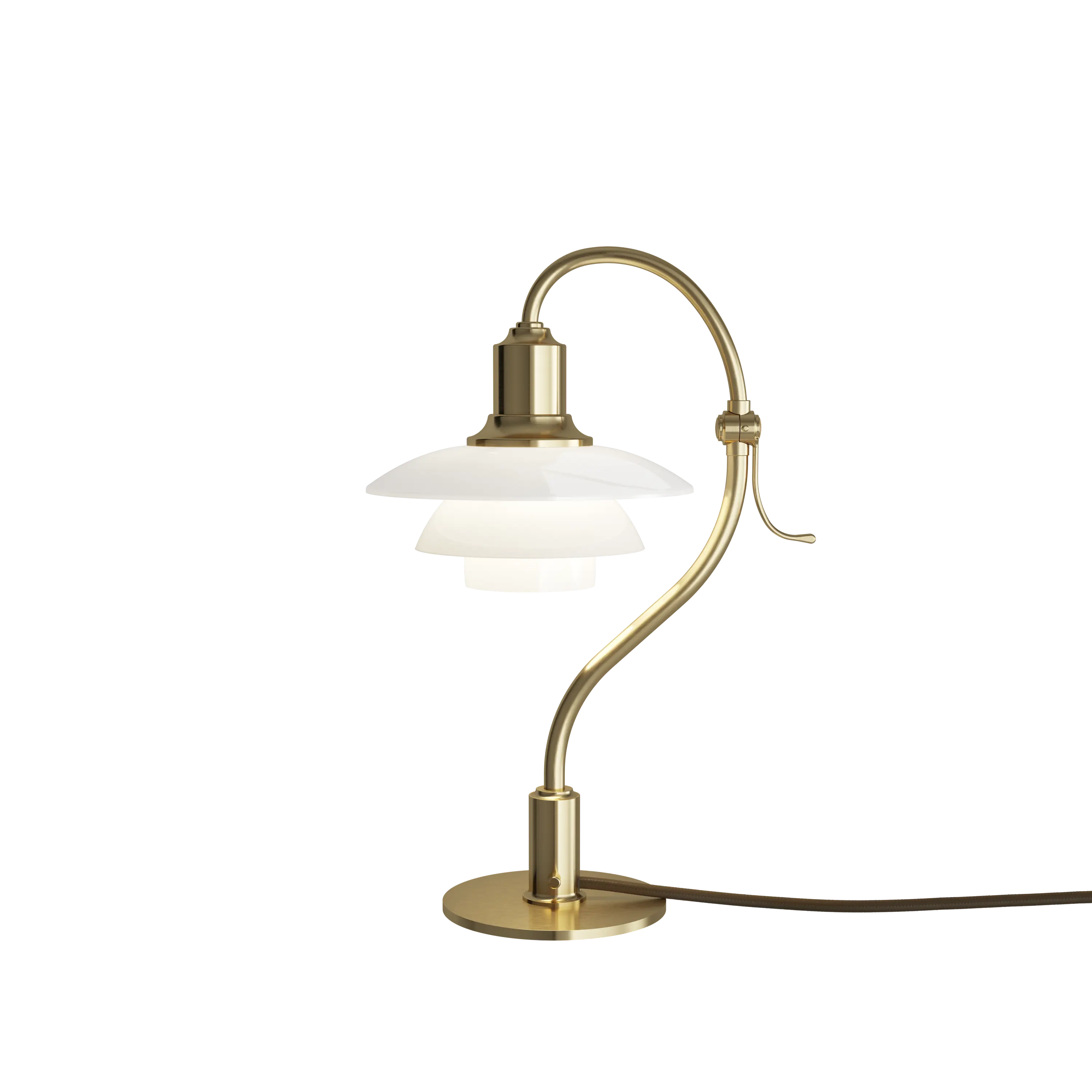 The 2021 limited edition of PH 2/2 The Question Mark comes with an adjustable lamp head similar to the original lamp. The adjustable lamp head that can rotate 45 degrees to either side is a key feature that makes it possible to direct the light wherever required. The adjustable upper part of the lamp can be tilted 45 degrees to the right or left by turning the handle. The shades of mouth-blown triple-layered opal glass add a natural individuality to the lamp where each shade represents a work of art. As with the original lamp, the brass will patinate over time and enhance the beautiful authentic look and feel of the 2021 limited edition of the PH 2/2 The Question Mark. Also made of brushed brass, a go-through switch is located on the stem near the base, alongside a brown textile cord that complements the exclusive design. PH’s initials are beautifully and discreetly engraved above the cord.
